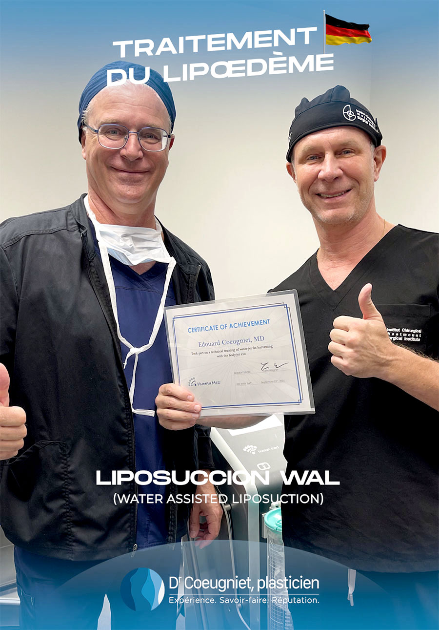 Dr. Coeugniet has honed his skills through international training and collaborations, alongside renowned lipedema surgery specialists in Europe —like Dr. Stefan Welss (Germany) and Dr. Stéphan Houyoux (Switzerland) —Dr. Coeugniet refined his mastery of Water-Jet Assisted Liposuction (WAL), a lymphatic-sparing method that delivers natural, lasting results. As an honorary member of the German Society for Lipedema Surgery, Dr. Coeugniet brings world-class innovation to every case, ensuring precision and minimal recovery time.